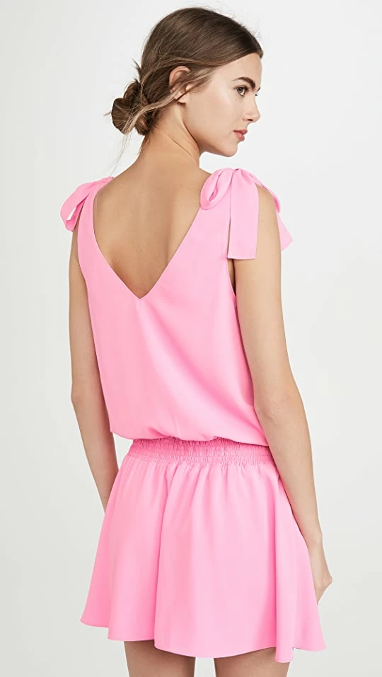 A popover silhouette in bright pink fabric, this Amanda Uprichard dress is as versatile as it is pretty. Charming bows at the shoulders add a signature touch to the piece.