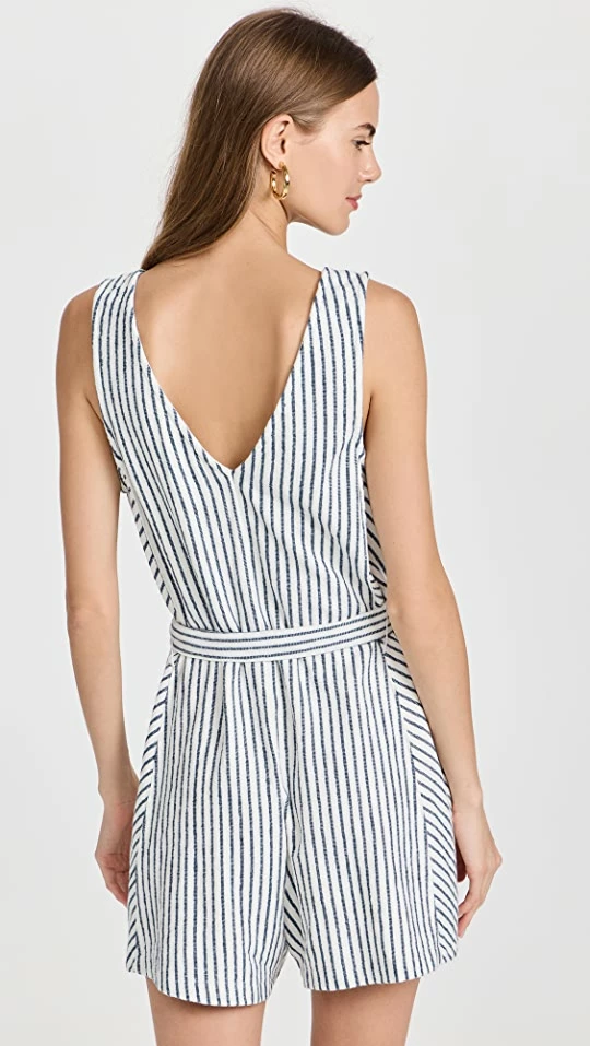 A polished one-and-done option for summer weekends, this Splendid romper is crafted from white cotton and tidily striped. A tonal belt circles the waist.
