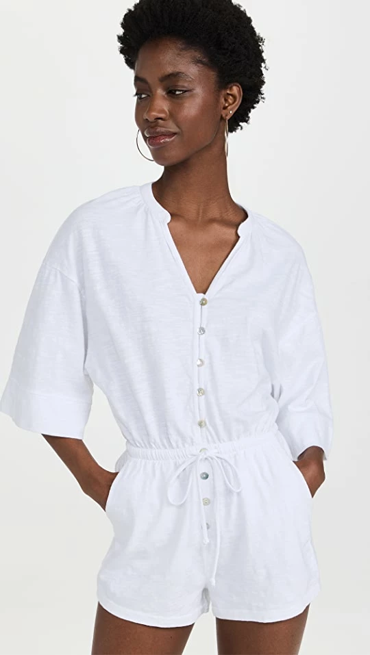 Effortless and ready for sunny temps, this Z Supply romper is crafted in bright white jersey and features a slouchy, button-front silhouette that’s easy to work into all sorts of summery looks.
